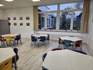 An einer Turmseite wurden neue, weiße Fensterelemente in drei Räumen eingesetzt. In der großen Aula wurde die mobile Wand zum Musikraum mit einem dezenten Grauton versehen. Zusammen mit den neuen Tischen, Bänken und Vorhängen ist die Aula jetzt zu einem einladenden Arbeits- und Aufenthaltsbereich geworden.