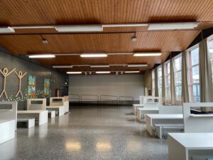Damit alle Kinder in Ruhe und mit ausreichend viel Platz essen können, wurde eine zusätzliche helle und moderne „Übergangsmensa“ eingerichtet. Sobald die geplante neue Schulmensa fertiggestellt sein wird, soll der Raum zu einem Konferenzraum umfunktioniert werden.