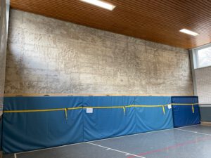 In unserer Sporthalle dürfen bereits seit längerem alle Klassen wieder ihre Sportstunden verbringen. Allerdings warten wir noch auf den Abschluss der baulichen Maßnahmen an den Wänden. Die Firma für das Verputzen der Wände wurde von der Stadt bereits beauftragt. Jetzt müssen noch die Geräteverankerungen vorbereitet werden und dann kann die Firma loslegen.