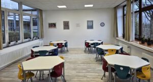 Damit alle Kinder in Ruhe und mit ausreichend viel Platz essen können, wurde eine zusätzliche helle und moderne „Übergangsmensa“ eingerichtet. Sobald die geplante neue Schulmensa fertiggestellt sein wird, soll der Raum zu einem Konferenzraum umfunktioniert werden.