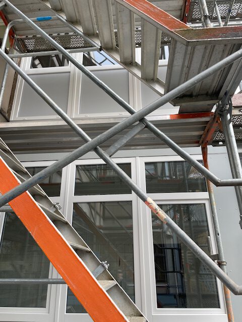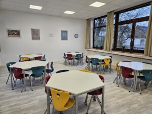 An einer Turmseite wurden neue, weiße Fensterelemente in drei Räumen eingesetzt. In der großen Aula wurde die mobile Wand zum Musikraum mit einem dezenten Grauton versehen. Zusammen mit den neuen Tischen, Bänken und Vorhängen ist die Aula jetzt zu einem einladenden Arbeits- und Aufenthaltsbereich geworden.