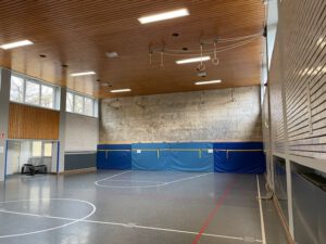 In unserer Sporthalle dürfen bereits seit längerem alle Klassen wieder ihre Sportstunden verbringen. Allerdings warten wir noch auf den Abschluss der baulichen Maßnahmen an den Wänden. Die Firma für das Verputzen der Wände wurde von der Stadt bereits beauftragt. Jetzt müssen noch die Geräteverankerungen vorbereitet werden und dann kann die Firma loslegen.